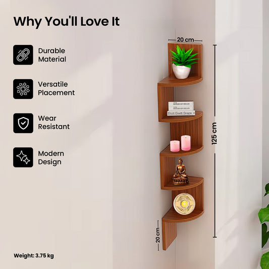 5 Tier Zig Zag Corner Wall Shelf for Living Room | Wall Mounted Shelf Engineered Wood | Durable & Sturdy Wall Shelf | Teak Natural | 1 Piece