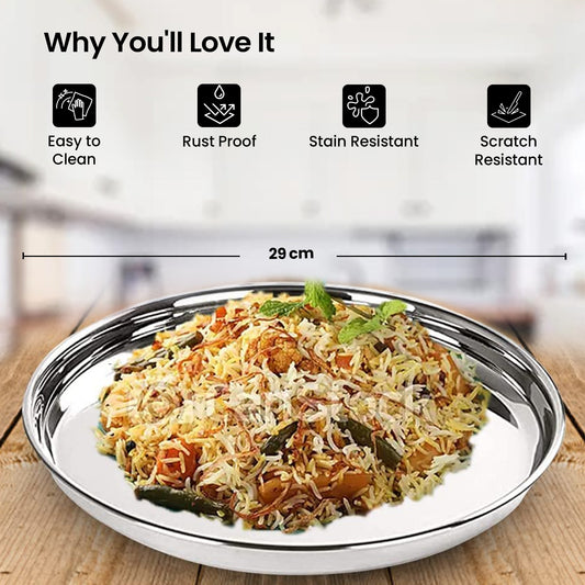 4 Pcs Big Steel Plate Set| Stainless Steel Dinner Plate Set | Blunt Edges, Deep Base |Glossy Finish, Durable, Easy to Clean, Stackable |Steel Plates for Lunch, Breakfast, Dinner