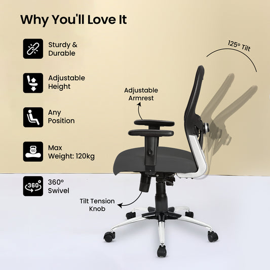 Apollo MId Back Ergonomic Office Chair with Tilt Lock Mechanism (2D Lumbar Support & Contoured Meshback, Black, 1 Piece)Regular price ₹ 20,000Sale price ₹ 20,000 Regular priceUnit price / per₹ 20,000Sold out
