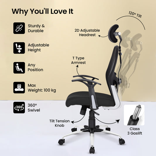 Atlas High Back Office Chair, Mesh Back Ergonomic Chair for Office Work at Home with 2D Adjustable Armrest, Headrest & Lumbar Support, Heavy Duty Metal Base (Black,1)Regular price ₹ 22,999Sale price ₹ 22,999 Regular priceUnit price / per₹ 22,999Sold out