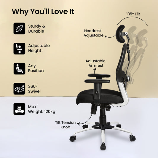 Comet Nylon Base HIGH Back Executive Office Chair with Adjustable Armrests & Headrest, Heavy Duty Nylon base, Mesh Back, Ergonomic Home & Study Chair, BlackRegular price ₹ 18,000Sale price ₹ 18,000 Regular priceUnit price / per₹ 18,000Sold out