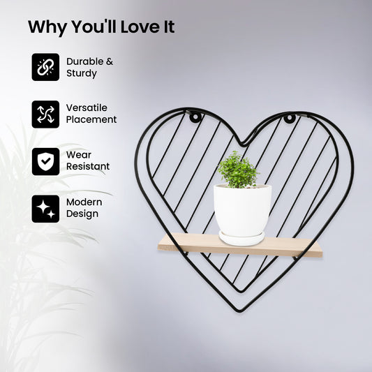 Wall Mounted Shelf - Heart Shape, Iron | Wall Decor | 24x8 Inches | Black