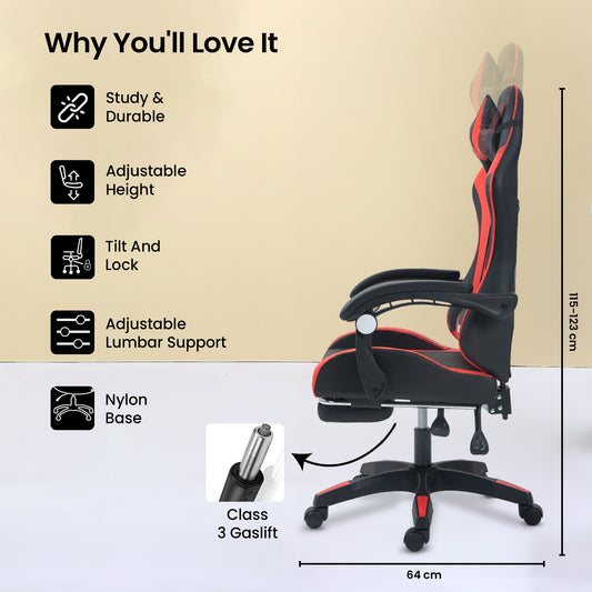 Snipe Gaming Chair with Retractable Footrest | 135° High Back Recliner Chair | Adjustable Armrest & Headrest with Pillow | Computer Chair | Multifunctional Ergonomic Chair - Red
