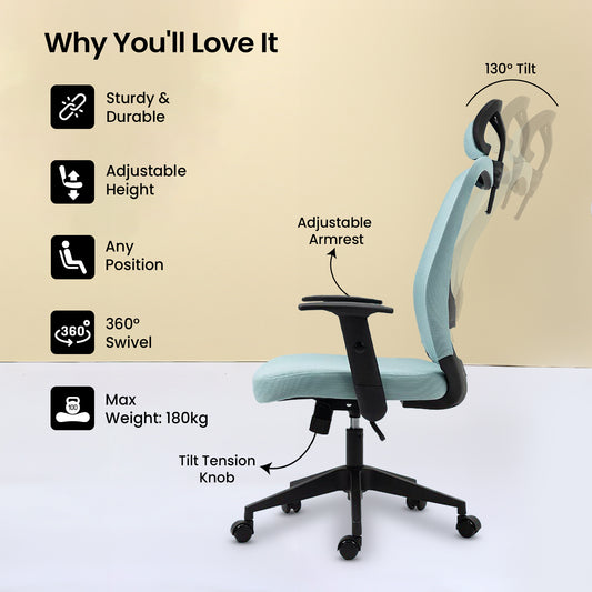 Nucleus High back Ergonomic Home/Study/Office chair with adjustable headrest, armrest & lumbar support | 130° recliner chair with height adjustable seat (Blue)